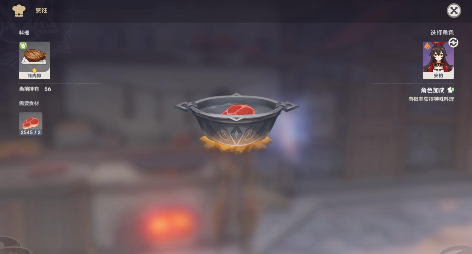 烤肉排是游戏中一种实用的一星料理,主要效果是复苏选中角色并恢复生命值。制作时需要消耗兽肉,基础配方为1份兽肉即可合成。如果使用安柏进行完美烹饪,还有概率获得特殊料理侦察骑士烤肉,效果比普通版本更强。这种食物在前期探险中性价比很高,适合多储备一些应对突发战斗。