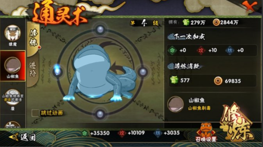提升山椒鱼的通灵等级,声望是必不可少的资源。山椒鱼作为雨忍村首领半藏的通灵兽,在战斗中能提供剧毒控制和团队增益,但培养它需要合理规划声望消耗。满级山椒鱼的声望需