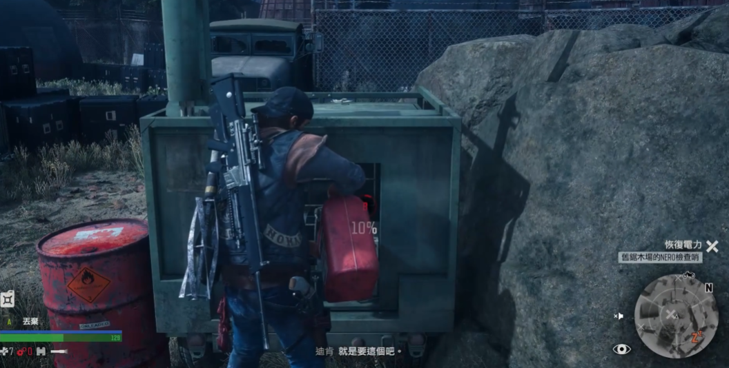 到了旧锯木厂后,咱们会发现这里分为两个主要区域:检查哨和暴走潮巢穴。检查哨的发电机就在场地中部的一块巨石旁边,而油箱则藏在右侧的帐篷里,稍微翻找一下就能看到。给发电机加油后,咱们就能恢复电力,解锁附近的快速旅行点。恢复电力时可能会触发小股丧尸,建议先清理周围再操作。如果是冲着暴走潮来的,建议白天行动,因为晚上丧尸更活跃,容易陷入包围。