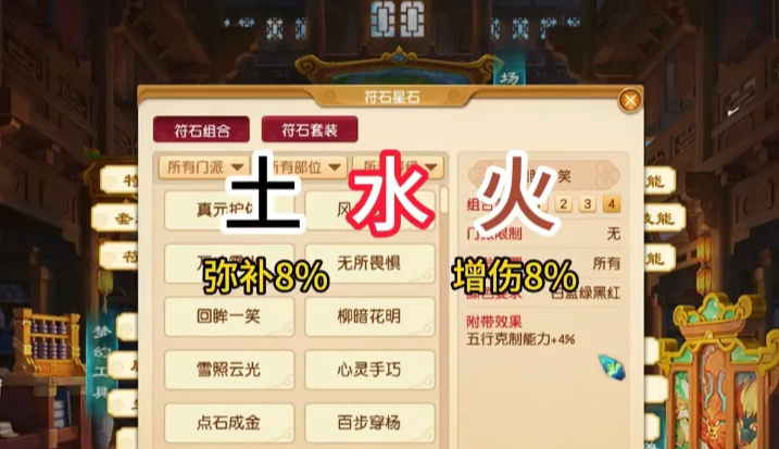 具体选择哪种五行属性,要根据武器五行来搭配。金克木就选烈火燎原,木克土就选参天古木,以此类推。如果追求稳定输出,建议选克制自身武器五行的钟灵石,比如木属性武器搭配,能有效抵消被金属性怪物克制的劣势。若想极限增伤,则选自身武器克制的属性,比如木属性武器搭配土属性钟灵石,对土属性目标造成额外伤害。记得搭配回眸一笑符石和门派经脉,能进一步提升克制效果。