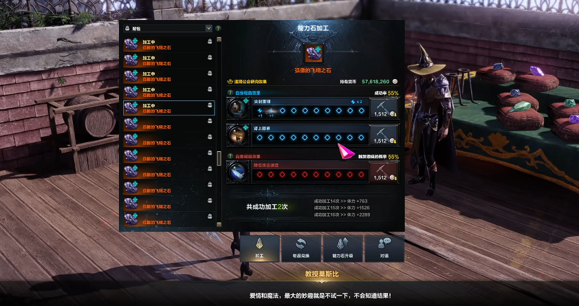 加工能力石的时候,你会看到三种属性,两种是增益效果,一种是减益效果。建议在成功率高的时候先点增益属性,成功率低的时候再去点减益属性。必须把所有格子都点满才能完成加工,所以别着急,慢慢来。加工完成后,能力石就能装备了,它会给你加血量和铭刻点数,品质越高的石头加的越多,橙色石头最厉害。