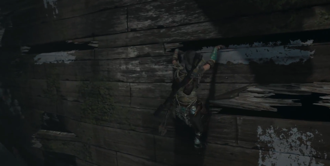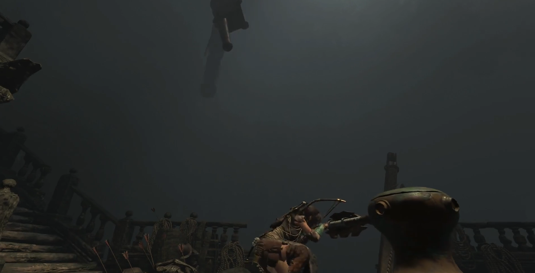 关键操作在于利用桅杆作为动态桥梁。当桅杆被释放后,需攀爬至船外岩壁洞穴,通过摆荡回到桅杆上端,推动底层转盘调整桅杆角度,使其与高处的宝箱形成通路。这一阶段需注意时间差,在桅杆转动到位时迅速跳跃,错过位置需重新调整转盘。成功抵达宝箱区域后,继续向上攀爬至最终机关处,用绳索箭矢连接两侧固定点搭建通道。