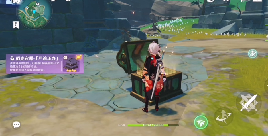 找到地方后会发现有几个机械守卫在巡逻,这些家伙战斗力不算特别强,但建议提前准备好合适的队伍应对。击败它们后就能看到闪闪发光的奇馈宝箱啦!开箱时记得调整好角度,因为有时候宝箱会被地形或建筑挡住视线。打开宝箱瞬间就能自动获得图纸,系统会贴心地弹出提示告诉你新增了稻妻官邸-严谕正办这个制作配方。