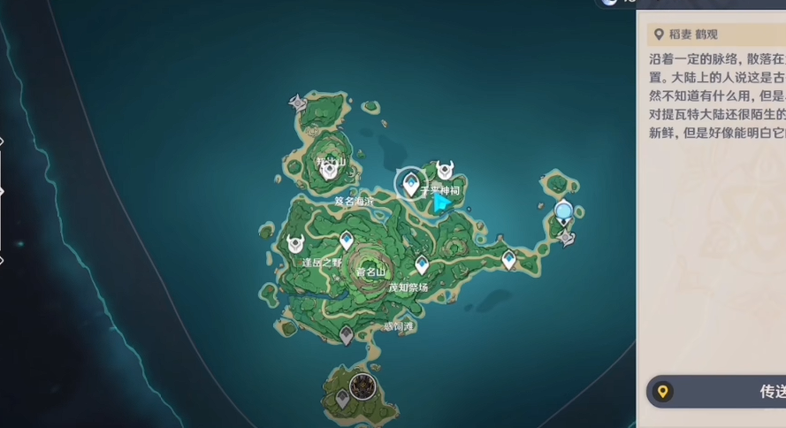 获得稻妻官邸严谕正办的图纸,咱们得先传送到鹤观岛的千来神祠附近。具体位置在地图东北方向的岛屿上,那里有个明显的传送锚点可以直接飞过去。到达后记得观察周围环境,因为目标宝箱就在这片区域的高处平台上,可能需要稍微爬点山或者绕路才能找到正确路径。