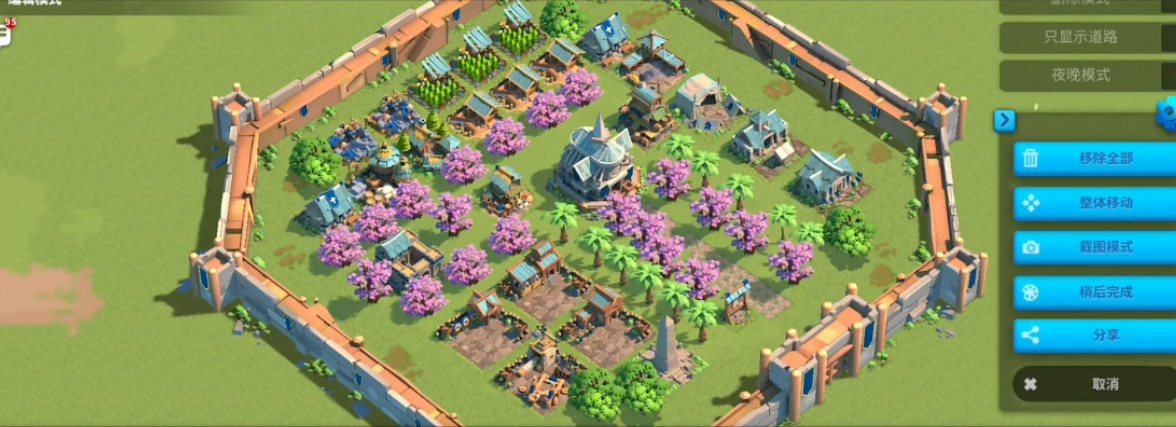 城市编辑功能是优化布局的核心工具,通过建造界面的锤子图标可进入编辑模式,支持保存三套预设方案。整体移动功能可一次性调整所有建筑方位,夜晚模式和仅显示道路选项有助于精细定位。删除全部按钮可重置布局,但需谨慎操作。装饰性物品如云杉铲除后可返还10%资源,道路铺设虽无实际功能但能提升视觉分区效果。布局完成后可通过联盟频道分享方案,或复制其他玩家的优秀设计。