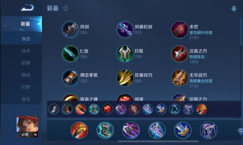 打野路线的出装以贪婪之噬起手,配合抵抗之靴减少控制时间,核心装备选择暗影战斧和冰痕之握。暗影战斧提供冷却缩减和穿透,提升技能频率和伤害;冰痕之握的减速效果能配合技能打出持续控制,增强留人能力。后期补上破军来强化收割,对残血目标造成高额伤害,最后一件装备根据局势选择魔女斗篷或名刀司命,以应对法师威胁或提高保命能力。