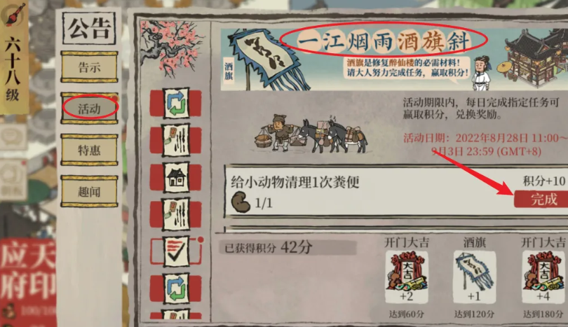 除了独立的积分兑换活动,酒旗也常作为修复特定历史建筑的必需材料出现。例如在修复醉仙楼的活动中,玩家需要收集包括酒旗在内的修葺材料。活动期间,将醉仙楼放在城镇里,接着收集修葺材料,清单中就包含了酒旗。这类修复活动通常有明确的时间窗口,例如从某月某日持续到某月某日。玩家需在活动期间内,收集齐所有材料后点击修复,方可获得完整建筑,而酒旗则是其中关键一环。