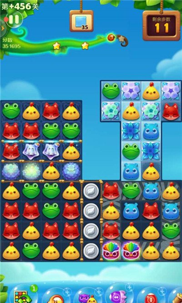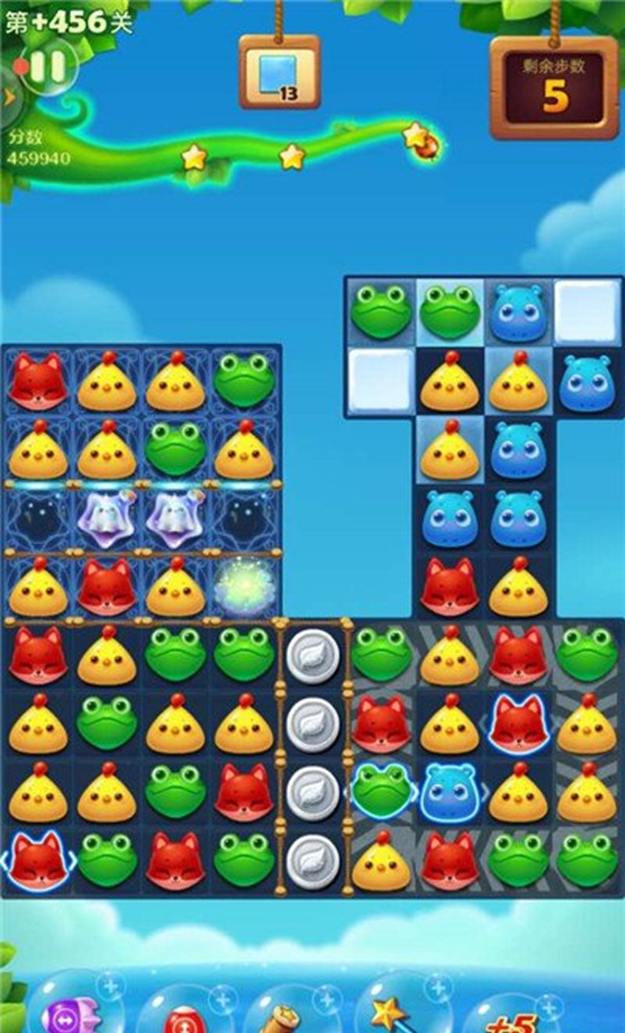 特效合成与组合释放是刷分的核心关键,四格直线消除可生成直线特效,触发后清除整行或整列元素,T型与L型五连消除能生成爆炸特效,消除范围覆盖周边九宫格,五格直线消除则合成魔力鸟,这一特效是高分爆发的核心。直线特效与爆炸特效相邻交换可触发大范围爆破,分数收益大幅提升,魔力鸟与直线特效交换会将全屏同色动物转化为直线特效并同步触发,魔力鸟与爆炸特效组合则全屏生成爆炸特效完成清屏式消除,双魔力鸟互换更是能直接清空棋盘并带来高额分数加成,合成特效时不要急于单独使用,尽量预留位置让特效相邻,等待合适时机组合释放,尤其是障碍物密集区域,一次特效组合可清除大量障碍并获得海量分数。