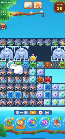 开局需聚焦棋盘上方的魔法罐与金色石块,通过小鸡、青蛙、河马的连续组合消除打破猫饼干封锁,让小动物顺利下落形成流动空间,这一步是打开局面的关键,切勿盲目消除下方零散动物。在解锁流动空间后,重点寻找L型、T型结构合成爆炸特效,或四连直线特效,利用特效大范围清除障碍,同时带动目标动物的收集,避免单步三消浪费步数。