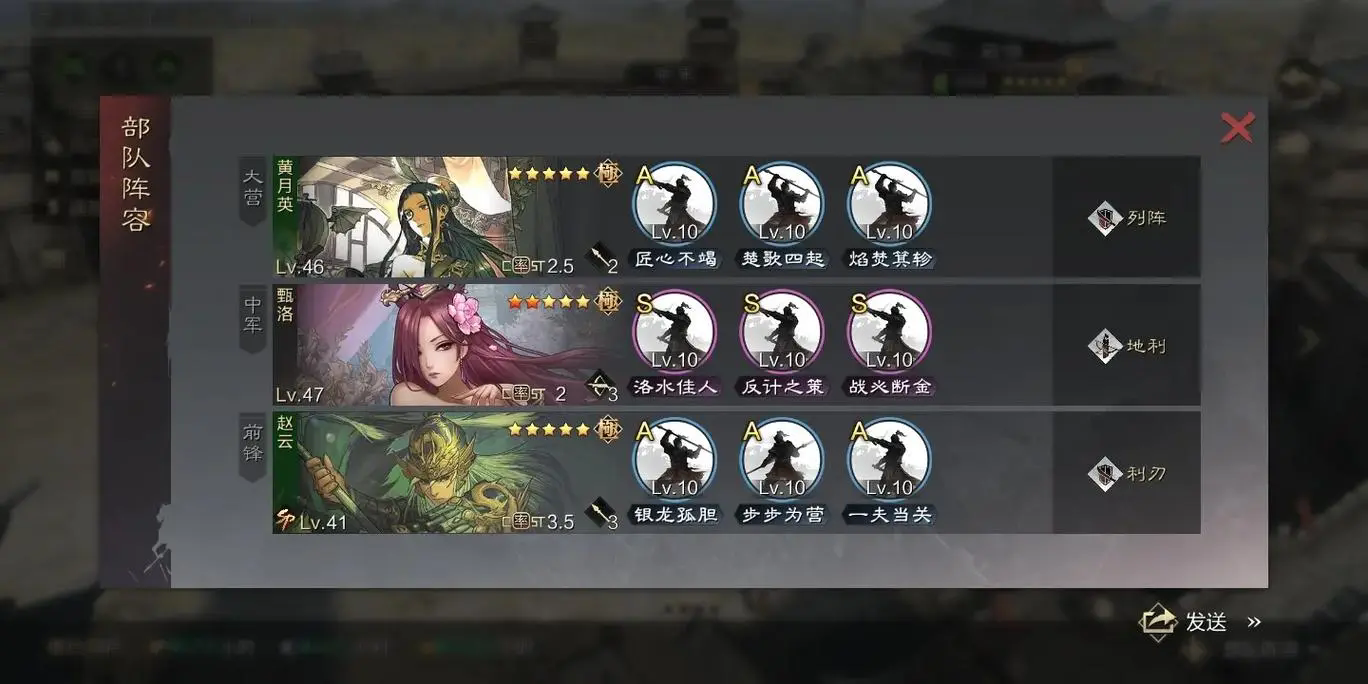 针对毓秀台高坦度肉步守军,换用蜀步或流氓队更稳,刘备+赵云+黄月英,刘备带妖术+步步为营,赵云带一骑当千+击势,黄月英带匠心+利兵谋胜,重步兵转守备、勇毅,靠刘备持续回血、步步减伤与月英稳定指挥伤害,慢慢磨穿守军,适合战损控制严格的场景。进攻站位必须调整,前锋放高减伤、援护武将,中军补控制与增伤,大营放核心输出,确保前3回合扛住守军爆发,同时快速压低守军兵力,避免被持续消耗。