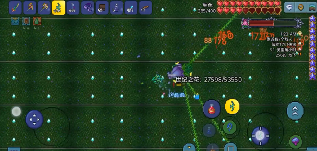 机械三王的挑战是中期关键,建议优先击败毁灭者(机械蠕虫)和双子魔眼,获取神圣锭制作神圣套装。战斗前需搭建多层平台并配备心形雕像、篝火等增益设施。击败三王后,丛林会刷新世纪之花花苞,摧毁后触发世纪之花战斗。该BOSS需在丛林环境中作战,建议使用高机动性装备如翅膀或闪电靴,并提前清理战场障碍物以保证走位空间。