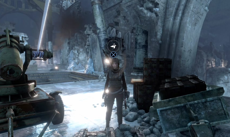 从前面的神庙回廊大本营继续前进,你会来到一个大厅,这里最初只有两个背对你的敌人,可以用烟雾弹悄悄暗杀。右拐角则埋伏着四名敌人,提前制造一个烟雾弹并找好时机使用会非常有效。清理完这个区域后,右转沿着绳索爬到一个紧闭的大门前,要打开这扇门,需要分别解决左右两条线路的机关。左侧的解法是沿着绳索滑到一辆废弃卡车上,然后向左爬上石桥,操作那里的绞盘并利用手推车将卡车撞落悬崖,从而拉断一根绳索。如果发现绞盘转不动,需要检查是否有其他交互条件未满足。